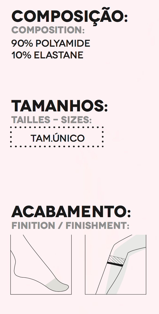 Mini Meia com licra Transparente com efeito brilhante, aspecto 15 Deniers. Acabamento com punho comfort anti-press, não prejudica a circulação. Contém 2Pares